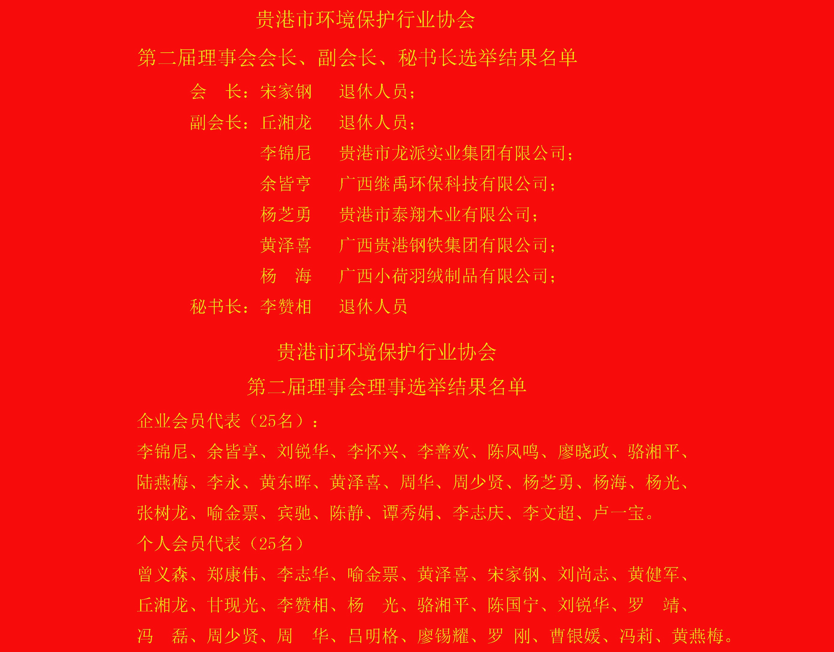 第一届理事会会长刘尚志主持会议,宋家钢同志作了《贵港市环境保护行业协会第二届理事会工作报告》。会议审议、表决通过了《贵港市环境保护行业协会章程》、《协会入会细则》、《协会选举办法》等。选举产生了贵港市环境保护行业协会第二届理事会理事42名、秘书长1名、副会长6名、会长1名。宋家钢任第二届理事会会长、李赞相任第二届理事会秘书长。